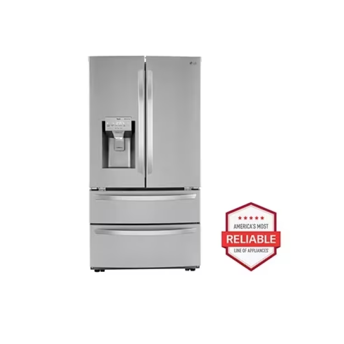 LG Counter Depth French Door Refrigerator, 69-3/4 in Height, 44-1/4 in Width, 43-1/2 in Depth, 22 cu-ft Capacity, 4 Shelves, Linear Compressor, 115 V, 15 A, 60 Hz, Auto-Close Door, 4 Doors, Stainless Steel, Additional Information: 7.2 cu-ft Freezer, 14.8 cu-ft Refrigerator, 665 kWh Energy Consumption, Slim SpacePlus® Ice System, Membrane/White LED Display, 2 Humidity Crispers Bins, 6 Door Bins, Pull Drawer Freezer, Wi-Fi Enabled
