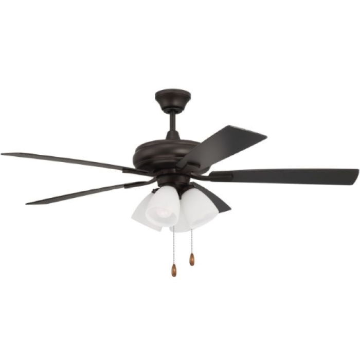 The Craftmade Eos 52" ceiling fan with white frost glass four-light kit including dimmable LED bulbs features a smooth, 3-speed, reversible motor, updated blade arms, and reversible custom 52" blades. Optional remote controls are available (Sold Separately).