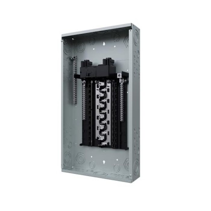 Siemens Main Breaker Load Center, Series: SN Series, 150 A, 120/240 V, 22 kAIC Interrupt, 3-Wire Wiring Configuration, 1 ph, 24 Spaces, 48 Circuits, Aluminum Bus, Plug-On Neutral Type, NEMA 1, 26 in L x 14.25 in W x 3.88 in D Enclosure Box, 27.13 in L x 15.5 in W x 3.88 in D, Powder-Coated, Gray