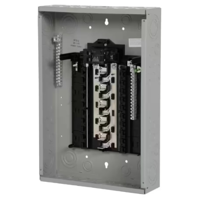 Siemens low voltage plug-on neutral ready Standard Series assembled load center. Main breaker with 20 1 in spaces allowing max 20 circuits. 1-phase 3-wire system rated 120/240 V (100 A) 22 kAIC. Special features - aluminum bus, gray trim NEMA Type 1 enclosure for indoor use.