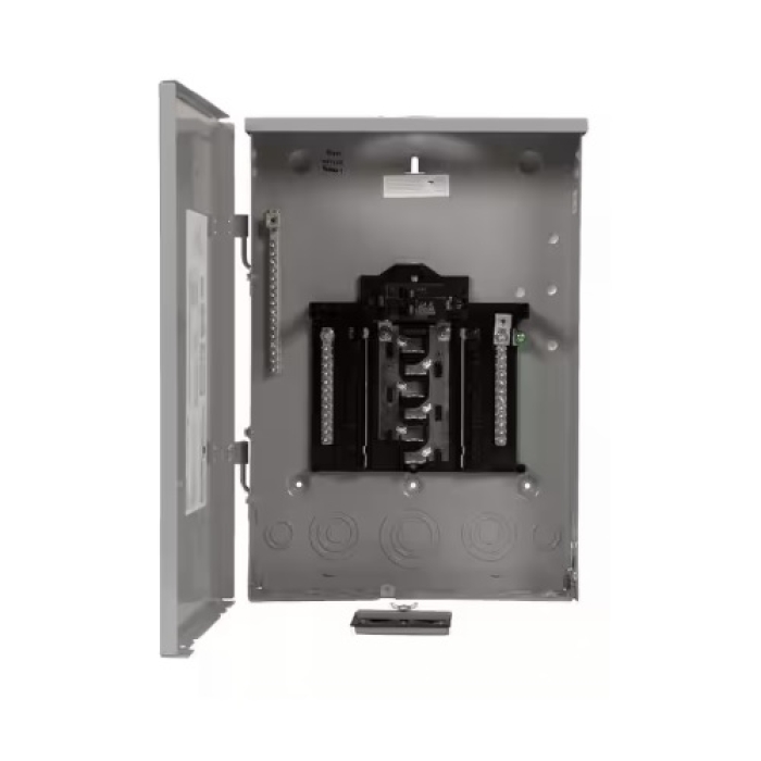 Siemens low voltage plug-on neutral ready Standard Series assembled load center. Main breaker with 12 1 in spaces allowing max 24 circuits. 1-phase 3-wire system rated 120/240 V (100 A) 22 kAIC. Special features - aluminum bus, gray trim NEMA Type 3R enclosure for outdoor use.